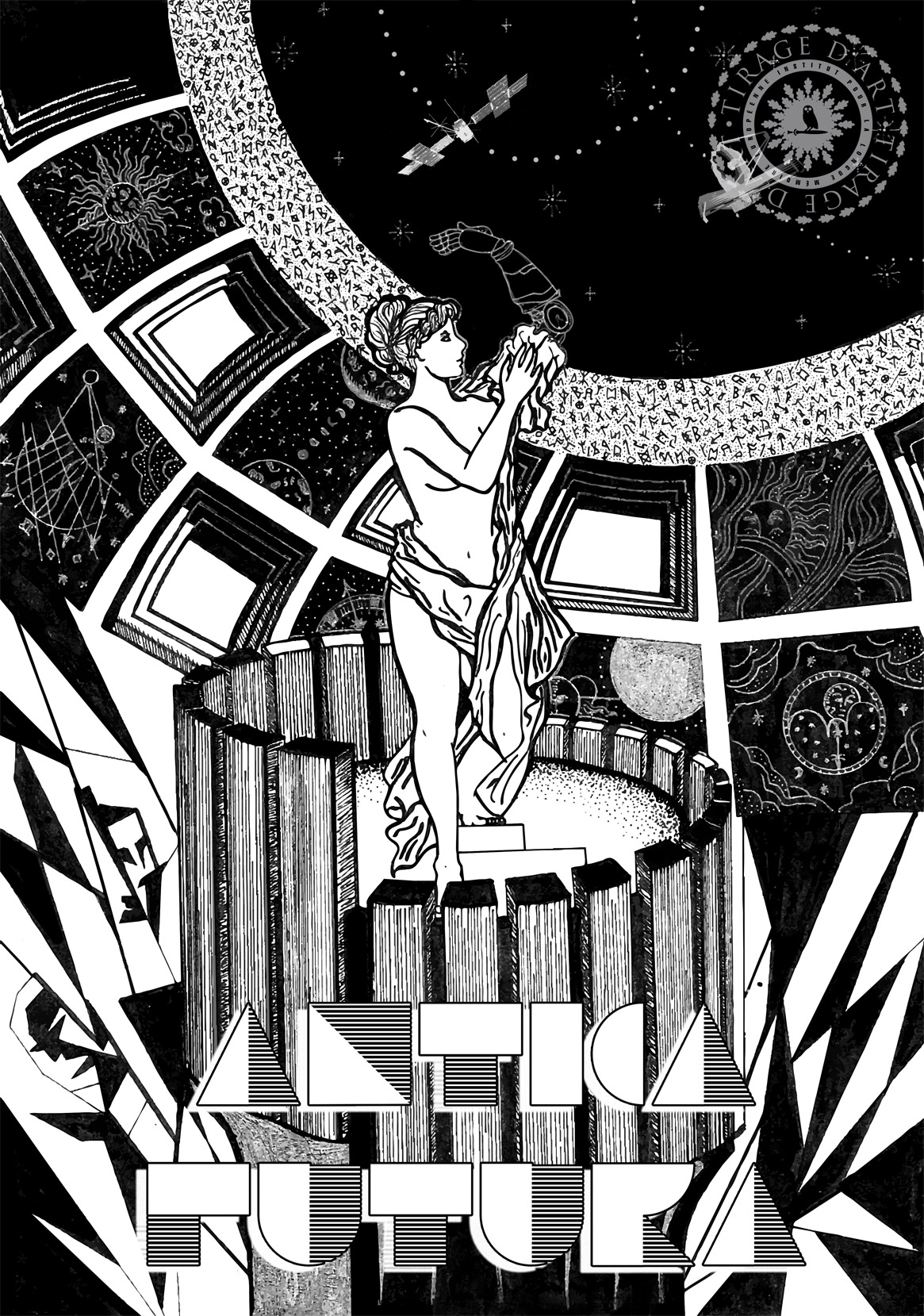 Au cœur d’un dôme où s’inscrivent les murmures du passé, runes oubliées et représentations célestes, une figure de marbre s’arrache à sa condition de pierre. Elle n’est plus tout à fait statue, pas encore tout à fait chair, et peut-être un peu cyborg.