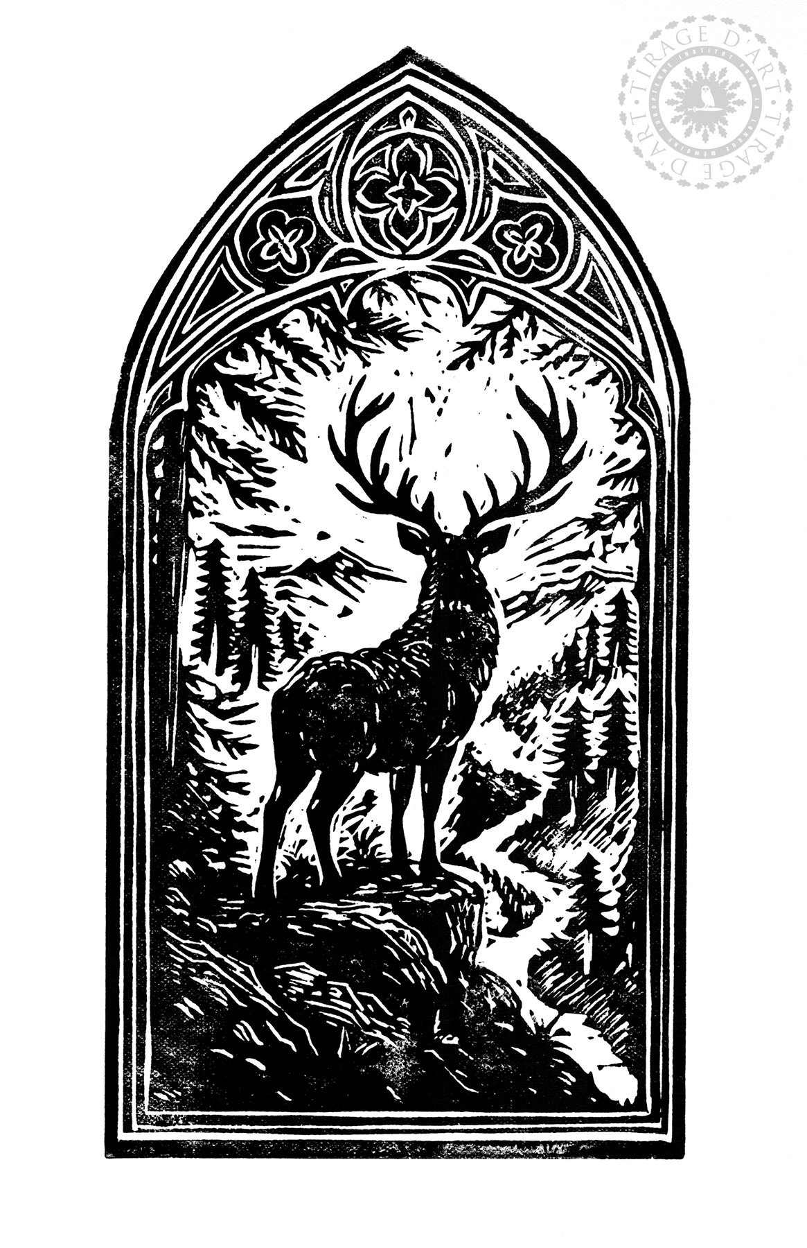 Majestueux cerf dressé au cœur d’une forêt profonde, cette composition puise dans l’imaginaire médiéval et le symbolisme européen. Encadrée d’une arche gothique finement ornée, elle évoque la noblesse sauvage, la force tranquille et l’appel des grands bois.